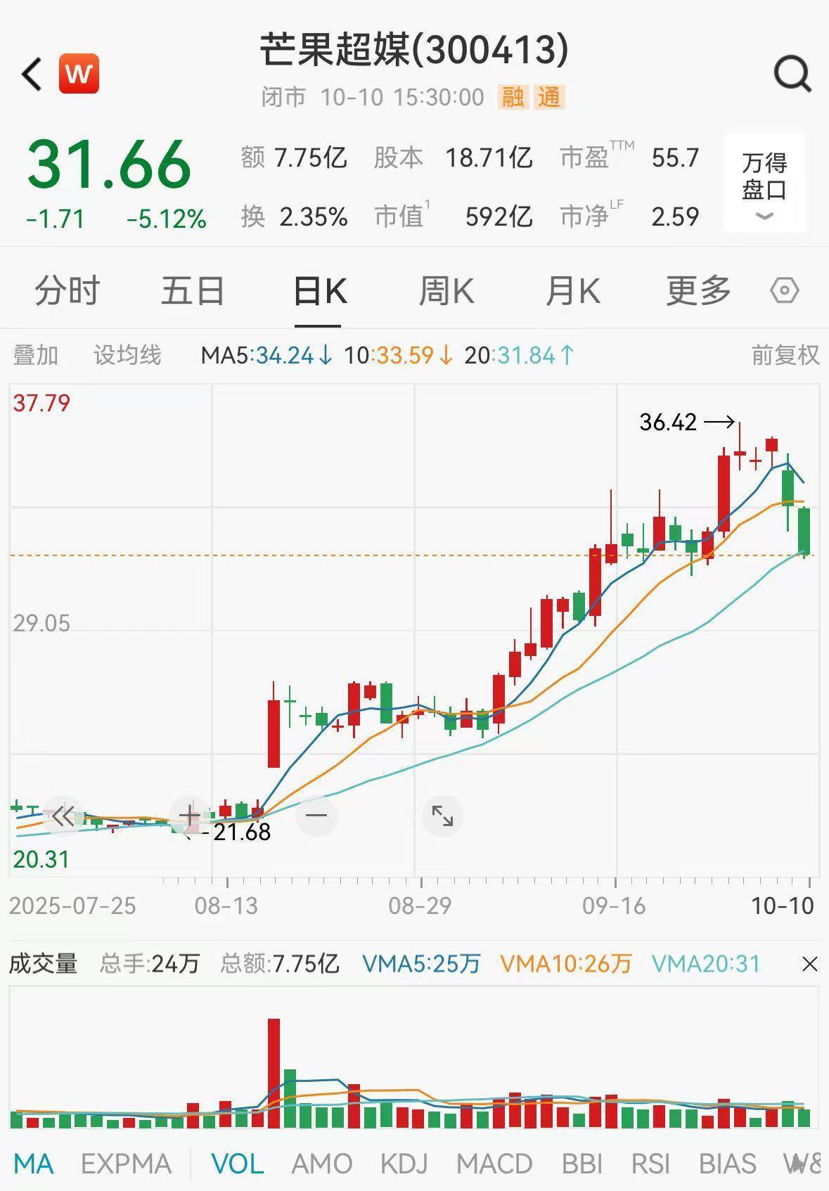10月10日,芒果超媒股价下跌5.12%,报收31.66元/股。10月9日易配宝,芒果超媒股价下跌6.68%,两日累计跌幅超过11%,总市值蒸发约76.70亿元。